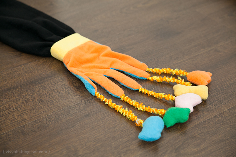 Ce este mai exact? Este o manusa cumparata de la petshop ce are pe fiecare deget cate un elastic cu cate o figurina din plus, cu clopotel in interior.